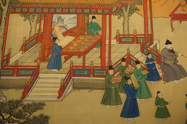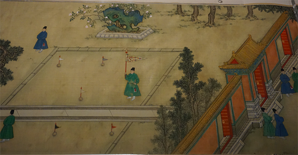 乾東五所與乾西五所,在明代是供地位較高的宮女居住的地方。明代宮女中未能升為嬪妃,但資格較老、地位較高者,得以居住在乾東或乾西五所?;实鄣娜槟福亲罡叩燃壍膶m廷女傭,例行居住在這一帶。乾東、乾西五所,明清兩朝也常有公主居住,清代也曾成為皇子的居所?,F(xiàn)場也展出了多幅描繪明代的皇帝在后宮中生活場景的繪畫,明代宮廷繪畫中有一類表現(xiàn)帝王生活和重大歷史事件的作品?!吨煺盎袠穲D》描繪的就是明宣宗朱瞻基便服簷帽在御園觀賞各種體育競技表演的場面。包括射箭、蹴踘、馬球、捶丸、投壺等,場面宏大繁復而又具體入微,生動地表現(xiàn)出當時宮中的文體娛樂活動。由于要反映特定的地點和環(huán)境,所以描繪了大量的建筑。此卷以工整細膩的寫實手法按照歷史原貌對明代皇宮的樓臺殿閣作了既真實又概括的描繪,是研究明代宮廷歷史以及皇家建筑的重要資料。
