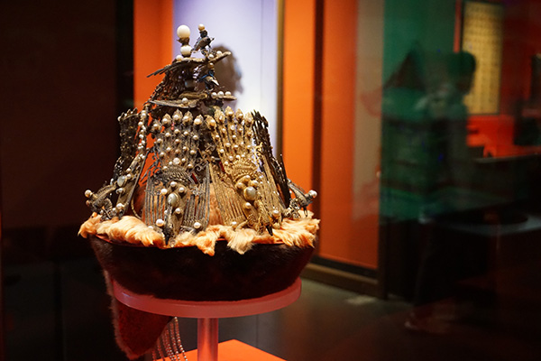 紫禁城里最熱鬧的就是有喜事的時候了,現(xiàn)場也展出了最高規(guī)格的婚慶場景——清代皇帝大婚時的配置:貂皮金鳳嵌珠寶皇后冬朝冠