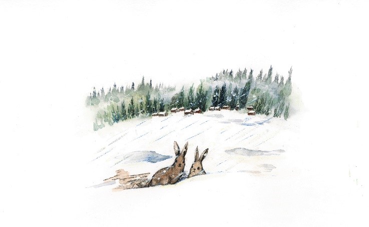 畫中還有兩個(gè)我必須提到的意象。第一個(gè)是 “提水站”,東北田地里最常見的小型建筑。東北的春天雨水不多,在田地里建個(gè)提水站為了方便灌溉。這種實(shí)用的小建筑通常是紅紅的房頂、白白的墻體。當(dāng)田野慢慢變綠,一排一排的“紅房頂”無(wú)疑是春天里最亮眼的顏色。有一幅畫中出現(xiàn)了“紅房頂”,細(xì)心的讀者一定能發(fā)現(xiàn)。另一個(gè)是“冬天”。任何地方的冬天都取代不了東北的冬天。作為東北人,對(duì)冬天的情感是熟悉且自豪,寒冷又溫暖。其中的“霧天”是我個(gè)人最喜歡的一幅。野兔兄弟出逃,在霧天走丟。當(dāng)霧終于散開,緊張又向往的心情浮現(xiàn)在兩只野兔的臉上——它們的背后是陌生的村莊,雪地很涼,村莊很暖,村莊后是一大片茂密的松樹。幾年前的初冬,我去過(guò)大興安嶺,置身松林的體驗(yàn)為我創(chuàng)作這幅畫提供了很多靈感。當(dāng)時(shí)我穿越大興安嶺,茂密的松林向后移動(dòng),車窗外的雪花簌簌地往后飛。降雪讓地面變滑,松林被風(fēng)吹得嘩嘩響,令我緊張又向往。