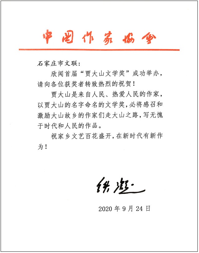 鐵凝在賀信中說:欣聞首屆“賈大山文學獎”成功舉辦,請向各位獲獎?wù)咿D(zhuǎn)致熱烈的祝賀!賈大山是來自人民、熱愛人民的作家,以賈大山的名字命名的文學獎,必將感召和激勵大山故鄉(xiāng)的作家們走大山之路,寫無愧于時代和人民的作品。祝家鄉(xiāng)文藝百花盛開,在新時代有新作為!