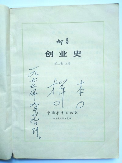 《創(chuàng)業(yè)史》責任編輯、中國青年出版社王維玲先生在專著《歲月傳真》(首都師范大學出版社2009年9月出版)中,給我們解開了這個疑問。王維玲在書中《柳青灑在〈創(chuàng)業(yè)史〉上的生死情》一文中這樣寫道:“《創(chuàng)業(yè)史》二部上卷出版了,我立即托人將樣書捎給他,為的是讓病中的柳青高興高興?!弊?960年《創(chuàng)業(yè)史》第一部問世到1977年出版第二部上卷,一晃過去了十多個春秋。柳青曾慨嘆:“這上卷寫于一九六○——一九六二年,放了十五年,重新拿起,一九七三年改了一次,一九七七年又改了一次,文學史上的小說,哪里有這樣雕刻的?!迸踔鴱谋本┣Ю锾鎏鏊蛠淼臉訒?,撫摸著光潔的紙張,嗅著油墨的清香,為了文學事業(yè)在“文革”中飽受肉體和精神折磨的柳青此刻不知作何感想。但可以肯定的是,他鄭重其事地在樣書扉頁簽下了這個此生值得紀念的日子。由于樣書直接來自出版社,未在市場流通,因而書上見不到加蓋的銷售印戳。