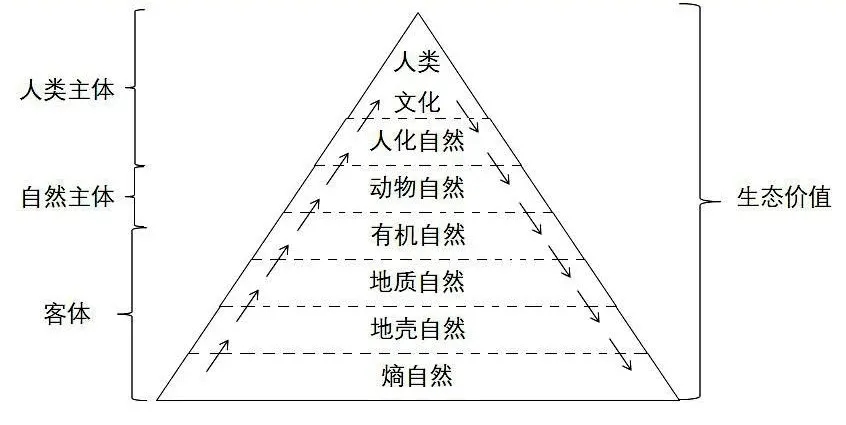 從進(jìn)化論的角度來看,所有價(jià)值都源于創(chuàng)生的自然:“大自然是生命的源泉,這整個(gè)源泉,而不僅僅是誕生于其中的生命,都是有價(jià)值的,大自然是一切的起源。”人類文化是由具有主體意識(shí)的人類創(chuàng)造出來的,它是大自然進(jìn)化到高級(jí)階段的產(chǎn)物,因此在這一模型里,客體的自然價(jià)值處于最底層,人類文化創(chuàng)造的價(jià)值處于最頂層。自然進(jìn)化過程中產(chǎn)生的價(jià)值之間是相互聯(lián)系的,有些價(jià)值完全屬于客體,有些則部分依賴于主體,而后者深深植根于前者之中,需要前者的支撐與維護(hù)。所以這個(gè)金字塔從下到上,價(jià)值的主體性增強(qiáng),客體性減弱,且價(jià)值呈扇形逐步縮小。