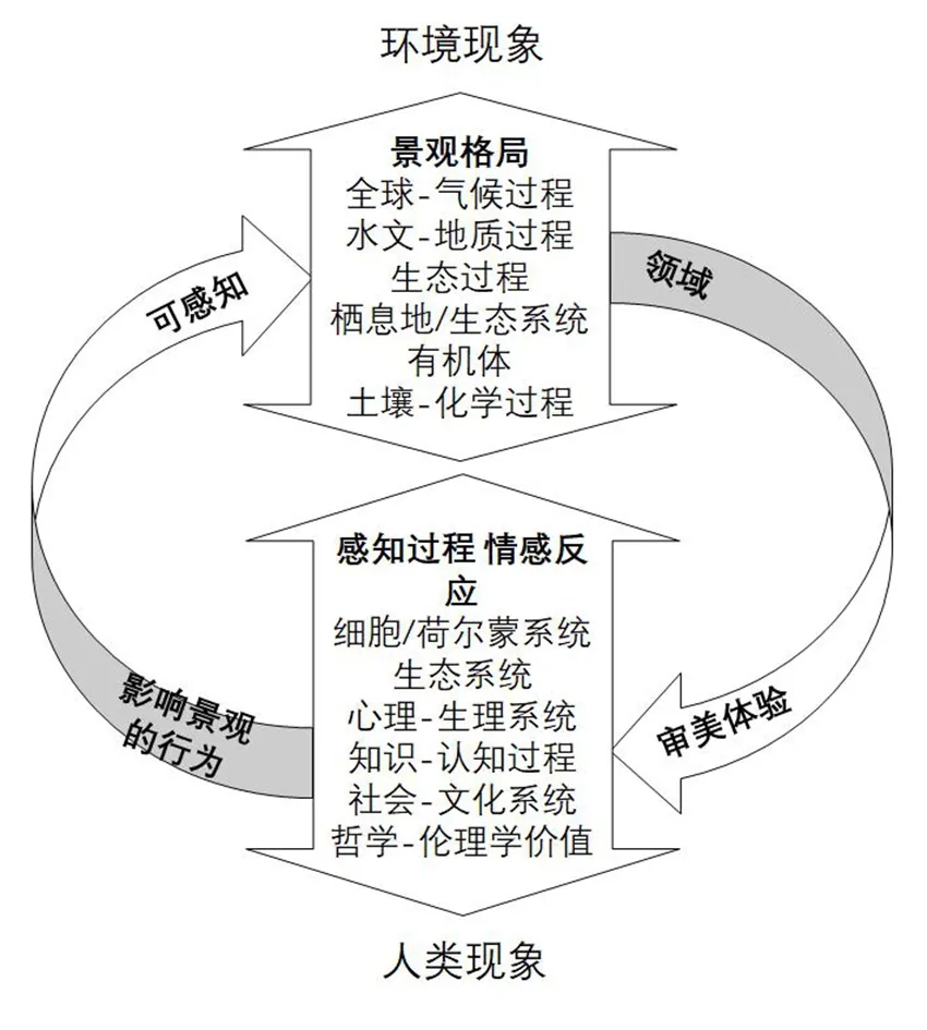 如圖2所示,美學(xué)與生態(tài)學(xué)在可感知領(lǐng)域(perceptible realm)聯(lián)結(jié),在這個(gè)領(lǐng)域內(nèi),“景觀的諸種格局(patterns)是相互關(guān)聯(lián)又相互依存的環(huán)境現(xiàn)象的可感知實(shí)例(instantiations)”。人與景觀是互動(dòng)的,人從景觀中獲得審美體驗(yàn),進(jìn)而會(huì)改變其行為;而人的行為又會(huì)改變景觀,景觀的改變最終會(huì)影響人類自身,這種影響既包括精神層面的,也包括身體層面的。