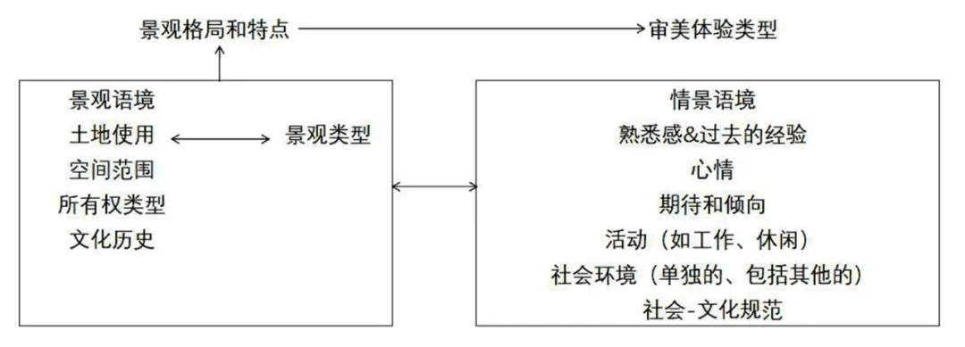 如圖2所示,審美體驗(yàn)在可感知領(lǐng)域內(nèi)的景觀格局中產(chǎn)生,而景觀語境和情境語境(situational context)以圖3所示的方式影響審美體驗(yàn)。景觀類型依據(jù)土地使用、空間范圍、所有權(quán)類型和文化歷史進(jìn)行劃分,不同類型的景觀會(huì)產(chǎn)生不同的格局和特點(diǎn),進(jìn)而產(chǎn)生不同的審美體驗(yàn)。情境語境對(duì)審美體驗(yàn)的影響體現(xiàn)在個(gè)人和社會(huì)兩方面,前者包括熟悉感和過去的經(jīng)驗(yàn)、心情、期待和傾向、活動(dòng),后者包括社會(huì)環(huán)境和社會(huì)—文化規(guī)范。這些因素會(huì)構(gòu)成不同的情境,同一個(gè)人如果身處不同情境,即使面對(duì)同一景觀,也會(huì)產(chǎn)生不同的感知,進(jìn)而產(chǎn)生不同的審美體驗(yàn)。此外,景觀語境與情境語境之間也存在相互作用:一方面,特定的景觀類型要求觀察者持有相應(yīng)意圖,這會(huì)影響人們?cè)诟兄坝^時(shí)的社會(huì)規(guī)范與個(gè)人期待;另一方面,觀察者的意圖不同,他所秉持的社會(huì)規(guī)范與個(gè)人期待也就不同,這些規(guī)范和期待會(huì)影響不同類型的景觀中可感知到的特點(diǎn)。