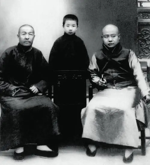 現(xiàn)存最早的啟功先生照片,約10歲時與祖父毓?。ㄗ螅┖徒阏桑ㄓ遥┑暮嫌?。