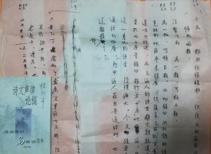 如前所述,先生晚年因視力衰減已不便用毛筆書寫,但他為了便于手寫本《詩文聲律論稿》的修訂,硬是用硬筆在若干綿紙上書寫了修補內(nèi)容,并一一注明補放在何處。當他把這一疊耗費了極大心血的綿紙交給我時,我真是滿含熱淚,感動不已。