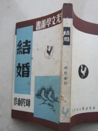 之后的“晨光文學(xué)叢書”也延用了這一樣式,同樣為人稱道。如師陀的《結(jié)婚》,淡藍(lán)色和鐵紅二色搭配,上下各涂一同寬的鐵紅色條,左側(cè)為一縱向的藍(lán)色塊,上嵌人二分之一鐵紅色條內(nèi),下置全書三分之二略多處,書名“結(jié)婚”用黑色的美術(shù)字印于藍(lán)色塊內(nèi),右下三分之一處為一藍(lán)色正方形,中畫一對鴦鴦,象征全書寓意。由于淡藍(lán)色底與黑色書名對比鮮明,《結(jié)婚》的書名便顯得極為醒目,仿佛跳入讀者的眼睛,令人愛不釋手。而這種條塊與圖畫相搭配并契合全書寓意的構(gòu)思模式,也成為“晨光文學(xué)叢書”的招牌樣式。