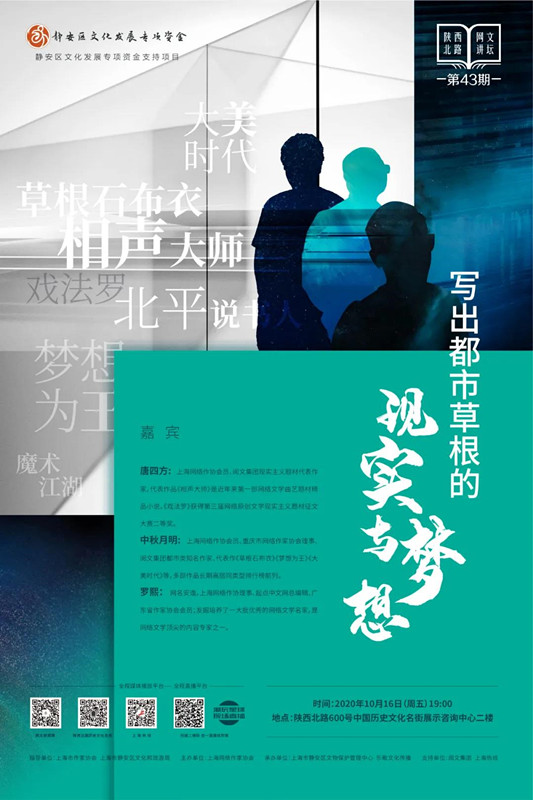 近幾年來現(xiàn)實主義題材網(wǎng)文作品影響日益強大,口碑、銷量俱佳的網(wǎng)絡(luò)小說改變了人們印象中網(wǎng)絡(luò)文學(xué)只是“言情穿越升級打怪”的文字,由于絕大多數(shù)網(wǎng)絡(luò)作家都是在工作之余寫作,他們筆下的現(xiàn)實生活反而更豐富多彩、更有質(zhì)感。本期陜西北路網(wǎng)文講壇邀請的兩位嘉賓唐四方、中秋月明便是這類寫作的代表作家,作品《相聲大師》《戲法羅》(唐四方)、《草根石布衣》《夢想為王》《大美時代》《我只想自力更生》(中秋月明)都在平臺有很高的閱讀量,《相聲大師》《草根石布衣》入選了國家圖書館永久收藏的100部網(wǎng)絡(luò)小說。