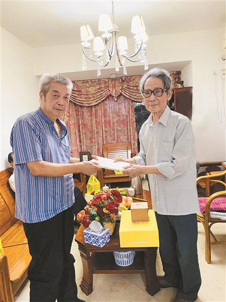 韋其麟(右)向中國作協(xié)副主席陳建功贈書。