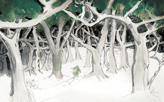 另外一位英國繪本畫家安東尼·布朗也是如此,他的繪本非常具有文學(xué)性。他講一只小熊在樹林中走,遇到各種危險,絕對不是樹林中出現(xiàn)狼或者怪物。他說恐懼的時候,每片樹葉、每棵樹干都體現(xiàn)了恐懼,當(dāng)小熊脫險之后,所有的樹葉都笑了。這是一種很有趣的直觀感受,是一種非常兒童化的表達(dá)。