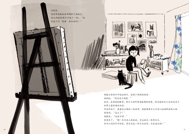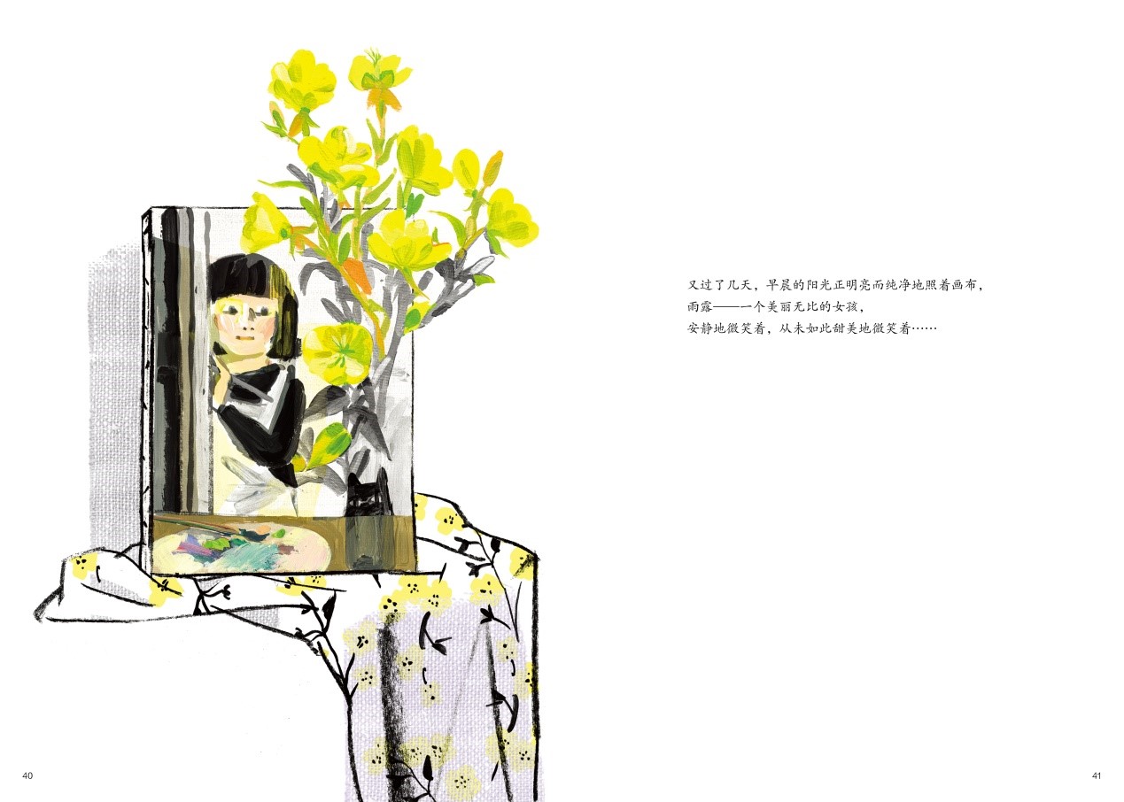 可是,我們也說了,在這場畫家和畫布之間的抗?fàn)幹校改笩o能為力,即使你勸她們放棄,即使你扔掉畫布,也不會有用。在這本書中,我們還是能看到父母的努力,尤其是她們沒辦法做到“袖手旁觀”。所以,隨著一天天過去了,雨露畫的一幅又一幅自畫像都被畫布?xì)У?,父母瞞著雨露把畫布扔掉了!但是,正像我們上面談到的,雨露不會放棄,經(jīng)過這場失而復(fù)得的尋找,父母知道了,在這堂屬于女兒的功課中,他們能做的是支持。雨露也知道了,她即將進(jìn)入一個全新的狀態(tài),一個在畫布前“忘了一切,聚精會神地畫著”的狀態(tài)。
