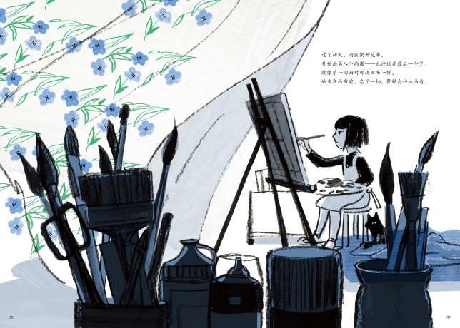 蘇西·李的構(gòu)圖一向讓人驚嘆,這次她不僅展現(xiàn)了精巧而豐富的構(gòu)圖,她還為炭筆的粗獷筆觸居然鋪上清爽的淡色,加上布料的真實紋理與代表性的小碎花圖案,從根本上改變了文字的厚重感,圖畫書讀起來非常的清新和文藝。大面積和主框架的黑色并不會給人壓抑的感覺,反而非常切合畫畫這個題材的氣質(zhì)。