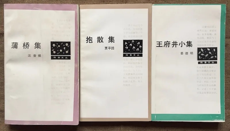 八十年代末到九十年代初,有幾套小開本值得一提:一是作家出版社的“四季文叢”,一套作家隨筆集。這套作為叢書,比較松散,扉頁(yè)、勒口或封底并沒有注明相關(guān)信息,用今天的標(biāo)準(zhǔn)來(lái)看,其實(shí)是難達(dá)標(biāo)的。據(jù)我所知,應(yīng)該出了四種,分別為汪曾祺的《蒲橋集》、賈平凹的《報(bào)散集》、姜德明的《王府井小集》和張承志的《綠風(fēng)土》,我收了前三種。素?zé)o記書帳習(xí)慣的我,惟那個(gè)時(shí)期,買書時(shí)會(huì)在扉頁(yè)上簽名,所以知道三本分別購(gòu)于和平里書亭和海淀圖書城。這套書除了選文比較精當(dāng)(體現(xiàn)了作家社的專業(yè)標(biāo)準(zhǔn))之外,最大特點(diǎn)是質(zhì)樸大方,沒什么花里胡哨花的元素:封面近乎素白,書脊設(shè)計(jì)很鮮明,即使豎插在書架中,也不至于看漏。用紙雖不高級(jí),但在那個(gè)時(shí)代也并不寒磣。