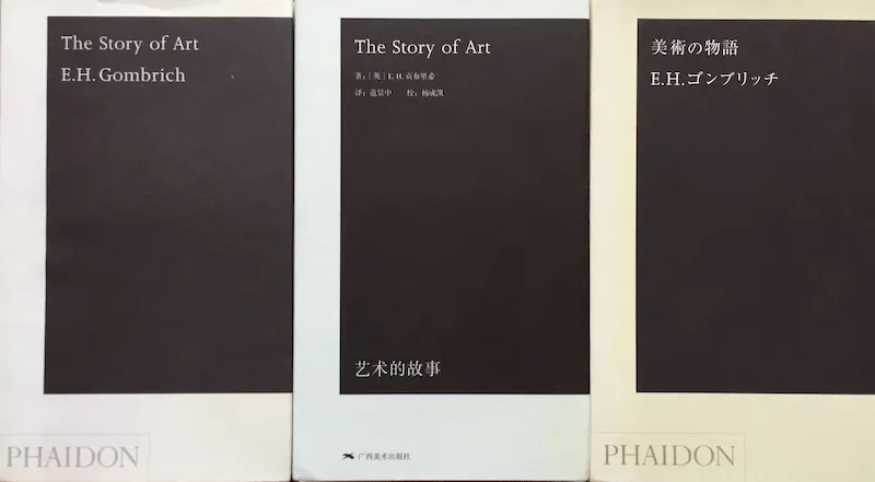 E. H. 貢布里希著《藝術(shù)的故事》,英、中、日文版。英、日文版為英國(guó)菲登版,中文版為廣西美術(shù)版,連版式裝幀都原汁原味地從菲登引進(jìn),也是南大社瘦版小精裝的由來(lái)