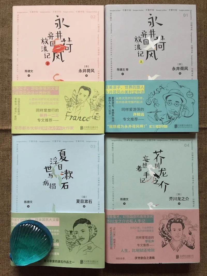 另一家我想到的蠻有日系文庫(kù)范兒的出版機(jī)構(gòu),是剛起步未久的一頁(yè)(folio)。這家社新近出品的“文豪手帖”叢書(全四種),分別為永井荷風(fēng)的《美利堅(jiān)物語(yǔ)》和《法蘭西物語(yǔ)》,夏目漱石的《浮世與病榻》及芥川龍之介的《妄想者手記》(四種均為陳德文譯,北京聯(lián)合出版公司2020年7月版),文庫(kù)版開本自不在話下,從封面到書衣,從和風(fēng)環(huán)襯到編號(hào)等要素,真與角川文庫(kù)的純文學(xué)系有得一比。盈握在手的瞬間,人就被治愈了。