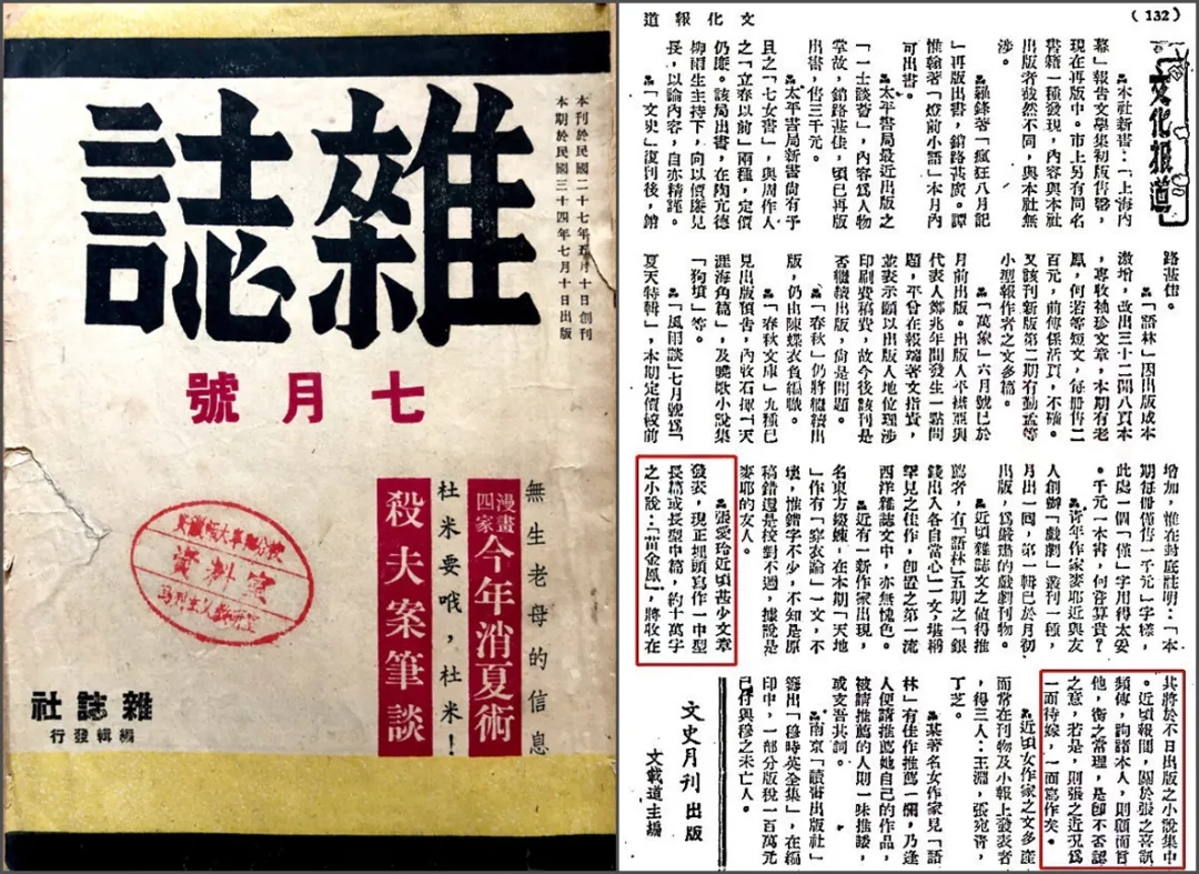 一九四五年七月出版的《雜志》第十五卷第四期“文化報道”有關張愛玲創(chuàng)作《描金鳳》的消息