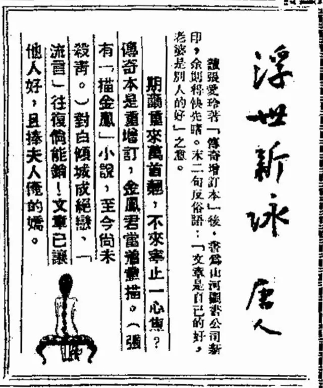 十二月三日《文匯報》“浮世繪”副刊載唐人作《浮世新詠》:“讀張愛玲著《傳奇增訂本》后。書為山河圖書公司新印,余則得快先睹。末二句反俗語:‘文章是自己的好,老婆是別人的好’之意。 期爾重來萬首翹,不來寧止一心焦?傳奇本是重增訂,金鳳君當著意描。(張有《描金鳳》小說,至今尚未殺青。)對白傾城成絕戀,‘流言’往復倘能銷!文章已讓他人好,且捧夫人俺的嬌?!碧迫思刺拼罄?,與張愛玲相識,自不同于其他小報作者。合而觀之,這段時間張愛玲在寫《描金鳳》,其間或有波折,至此尚未完成,且始終沒有發(fā)表機會,當是事實。然而包括唐氏在內(nèi),誰也不曾讀過原稿,均未談及到底寫的什么內(nèi)容。