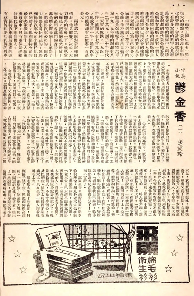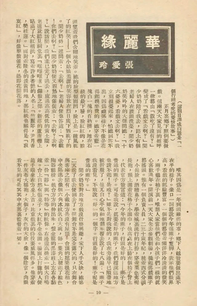 一九四七年四月《大家》第一期刊載張愛玲作《華麗緣》
