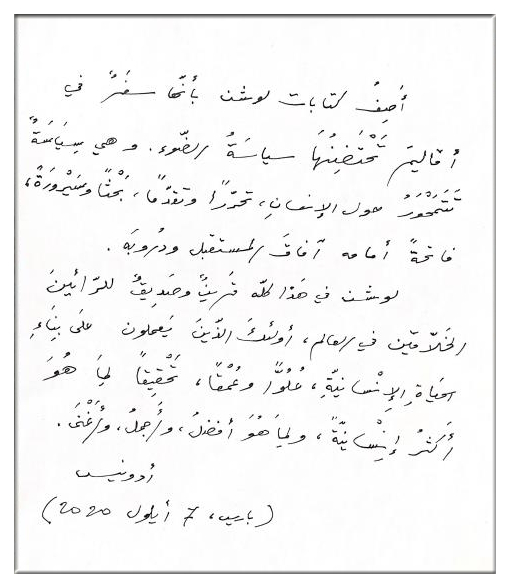 在艱難的疫情期間,整個世界被迫按下了暫停鍵,但文化、文學和友誼并不會因此停止,而是會找到新的繁榮之路,留下時代的痕跡。我的第二個愿望,便是希望能早日找到徹底解決這可怕病毒的方法,以便我們能以最安全和穩(wěn)妥的方式重新開始交流活動。