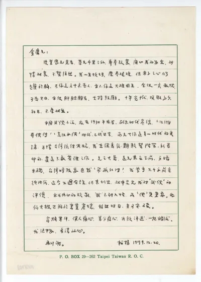 孫觀漢是著名的科學(xué)家。柏楊被判刑后,孫觀漢四處奔走,展開大力營救。在此信中柏楊、張香華向?qū)O觀漢說明沒有寫信的原因:修改校對幾部稿子,忙得不可開交。孫觀漢來臺卻不告知日期,怕給朋友添麻煩。