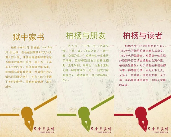 此次展覽中國現(xiàn)代文學(xué)館從柏楊先生捐贈的眾多書信中精選95封與讀者和觀眾們分享。展覽分三部分:“獄中家書”“柏楊與朋友”和“柏楊與讀者”,時間跨度從20世紀(jì)60年代延續(xù)到21世紀(jì)。在這些記錄日常生活的文字中,不僅飽含著父女親情和赤誠相待的友情,也閃爍著困境中人性的微光。