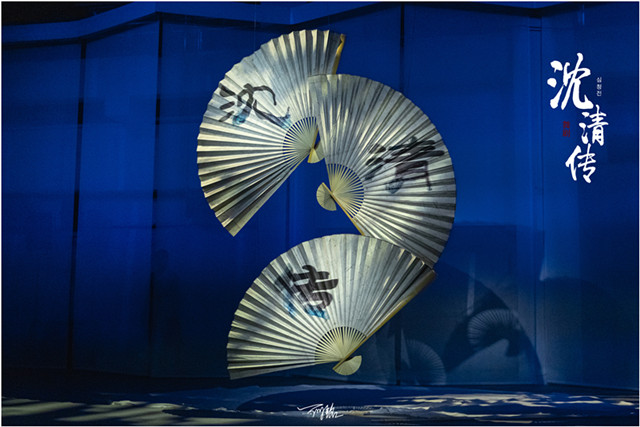 據(jù)本劇的總編導(dǎo)之一柯書劍介紹,在舞蹈設(shè)計(jì)編排上,巨幅折扇的運(yùn)用,是作為環(huán)境移變與劇情轉(zhuǎn)折的提示點(diǎn)和強(qiáng)化點(diǎn)。那么,折扇不僅僅是演員手中的一個道具,更是融入到劇情當(dāng)中的一個重要角色,承擔(dān)起了強(qiáng)化舞臺空間與劇情演變的功能。比如,當(dāng)寫有“祭” 字的折扇出現(xiàn)時(shí),提示進(jìn)入沈清要在祭祀儀式中被投入海中的重要情節(jié),瞬間調(diào)動觀眾情緒,扣人心弦。