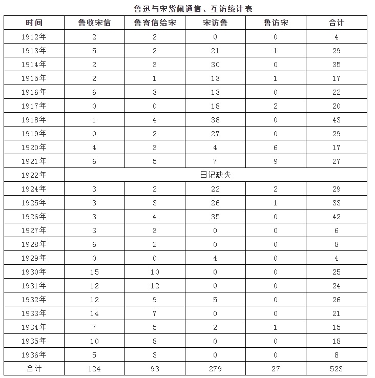 在魯迅的朋友中,有兩位可以稱得上是終生摯友,一位是許壽裳,另一位是宋紫佩。學(xué)界對(duì)魯迅與許壽裳兩人關(guān)系有持續(xù)深入的探討,但對(duì)魯迅與宋紫佩關(guān)系的探討頗為冷清。作為魯迅的同鄉(xiāng),宋紫佩曾經(jīng)是魯迅的學(xué)生,后來又與魯迅成為同事和摯友。從1909年相識(shí)到1936年魯迅去世,兩人的聯(lián)系一直未曾間斷,魯迅在杭州、紹興、北京、廈門、廣州、上海時(shí)均與宋紫佩保持聯(lián)系。即使在魯迅去世以后,宋紫佩與魯迅親友之間也依然保持著聯(lián)系。據(jù)筆者統(tǒng)計(jì),魯迅現(xiàn)存的日記(因魯迅1922年日記缺失)中提及宋紫佩的次數(shù)多達(dá)599次(魯迅親友的回憶中也多次提到宋紫佩)。從1912年至1936年間,宋紫佩寫給魯迅信121封,魯迅寫給宋紫佩信81封。宋紫佩拜訪魯迅280次,魯迅拜訪宋紫佩27次。具體可見下表: