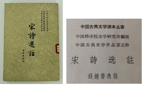 1958年9月初版錢鍾書《宋詩選注》封面及扉頁標(biāo)注:“中國(guó)古典文學(xué)讀本叢書|中國(guó)科學(xué)院文學(xué)研究所編校|中國(guó)古典文學(xué)作品第五種”