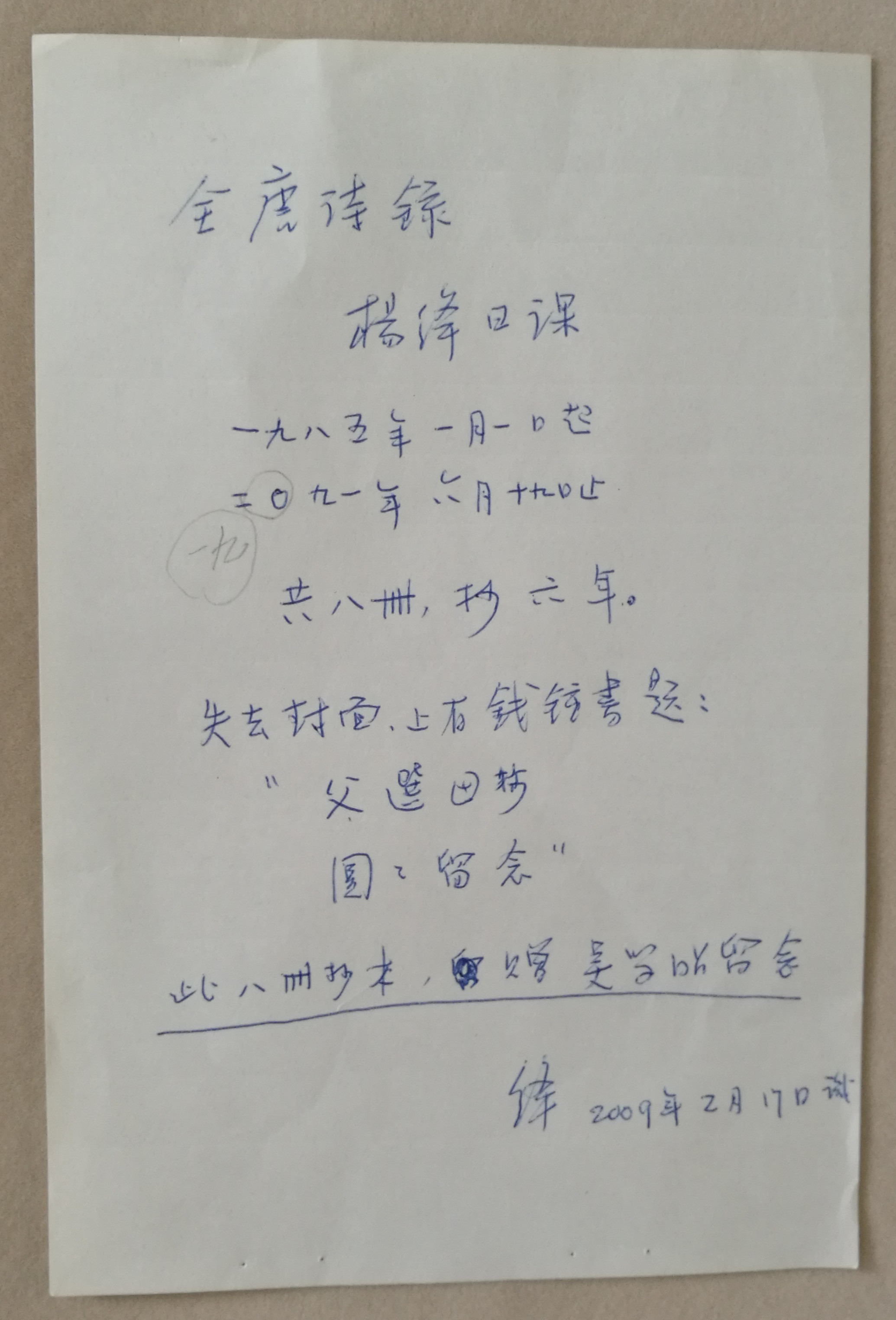 楊絳先生手書字條(字條下方書“此八冊(cè)抄本,贈(zèng)吳學(xué)昭留念”。原稿實(shí)為九冊(cè)。)