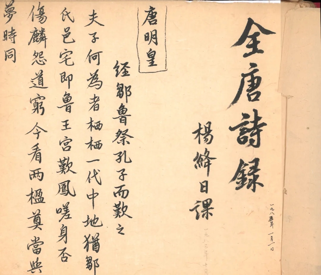 《全唐詩錄》稿本第一冊(cè)首頁。錢先生選詩中也不乏有帝王詩作,包括唐玄宗、唐宣宗、武則天等人作品,但其選詩也重在表現(xiàn)作者真誠(chéng)的情緒,如圖中這首《經(jīng)鄒魯祭孔子而嘆之》,表達(dá)了唐玄宗李隆基對(duì)夫子的同情與嘆惋之情。
