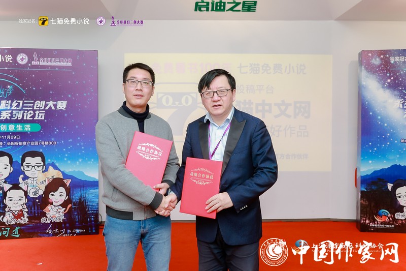 會(huì)上,七貓文化與北京大愛(ài)永生影視傳媒有限公司簽署了戰(zhàn)略合作協(xié)議,將繼續(xù)以科幻文學(xué)為核心,發(fā)展科幻文化產(chǎn)業(yè)的方方面面,將科幻之光輻射到更多的領(lǐng)域。