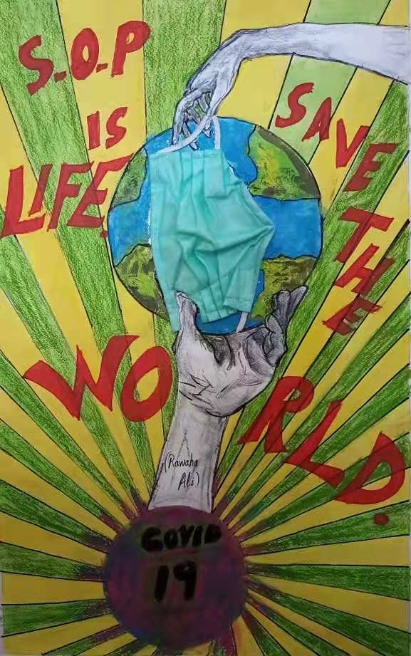 “Save the world”,一雙手為地球戴上了口罩;背靠多國國旗,身著防疫服的醫(yī)護人員將被捆綁的病毒微粒踩在腳下,將其清理鏟除;烏茲別克斯坦和中國兩國齊心抗疫,“我們一起贏”。