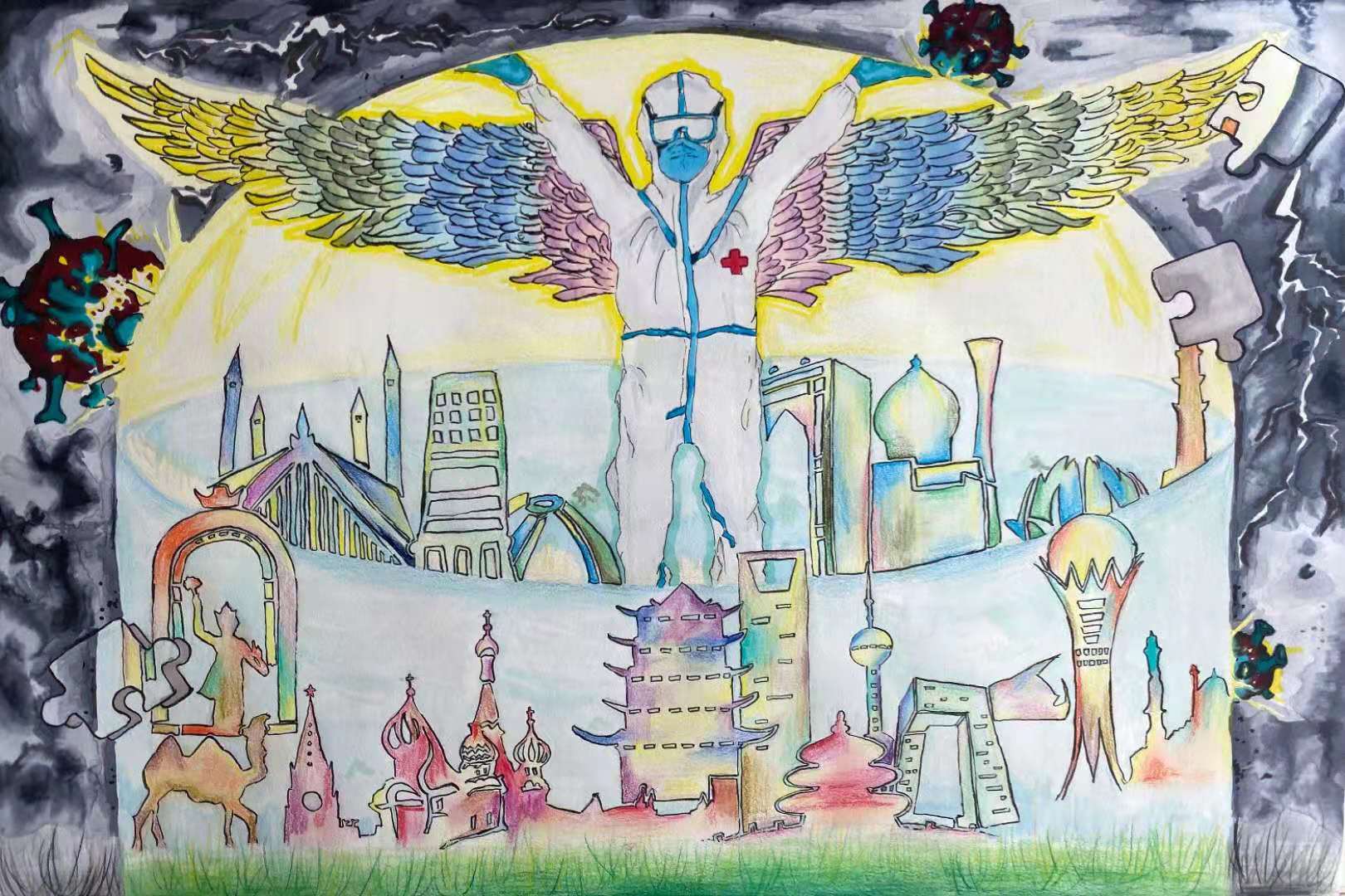 在展出的畫作中,地球、國旗、防疫服、各地地標建筑和多樣的自然環(huán)境,簡潔明了的環(huán)??谔枺菢?gòu)成畫面的主要元素。各元素的搭配組合,形成形態(tài)各異的作品。孩子們以無瑕的童真,用手中的畫筆展示他們對自然、對家庭、對祖國的愛,表達對友誼、對人類和平和美好未來的向往。