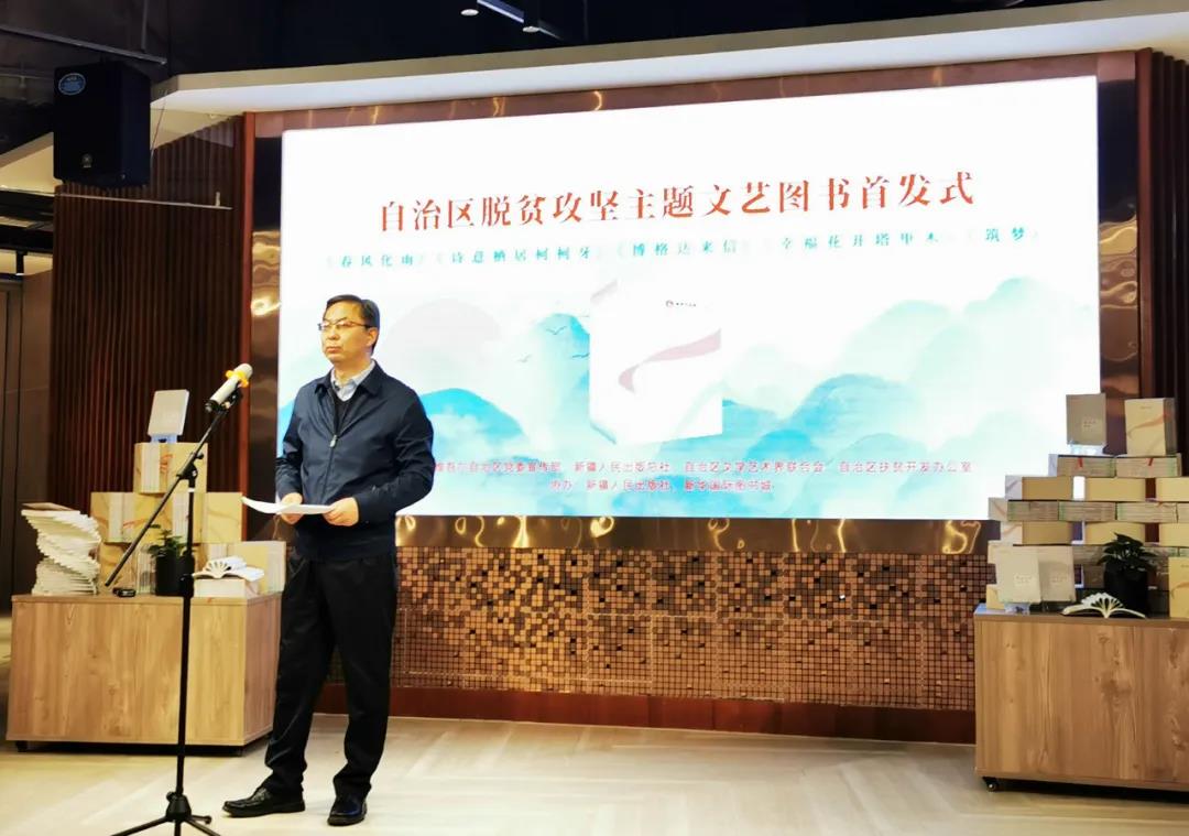 2020年12月4日,新疆脫貧攻堅(jiān)主題文藝圖書首發(fā)儀式在烏魯木齊新華國(guó)際圖書城舉行。新疆維吾爾自治區(qū)黨委宣傳部副部長(zhǎng)任彥賓、新疆維吾爾自治區(qū)扶貧辦一級(jí)巡視員陳雷、新疆人民出版總社黨委副書記、副總編輯范聰卓、新疆維吾爾自治區(qū)黨委宣傳部文藝處處長(zhǎng)張?zhí)?、新疆維吾爾自治區(qū)扶貧辦脫貧攻堅(jiān)督查專員張代茂、新疆人民出版總社出版編務(wù)部部長(zhǎng)羅衛(wèi)華,以及自治區(qū)黨委宣傳部機(jī)關(guān)團(tuán)委代表、自治區(qū)文聯(lián)代表、新疆人民出版總社代表,作家代表、譯者等參加首發(fā)儀式。新疆維吾爾自治區(qū)文聯(lián)黨組成員、秘書長(zhǎng)、新疆作家協(xié)會(huì)副主席熊紅久主持首發(fā)儀式。
