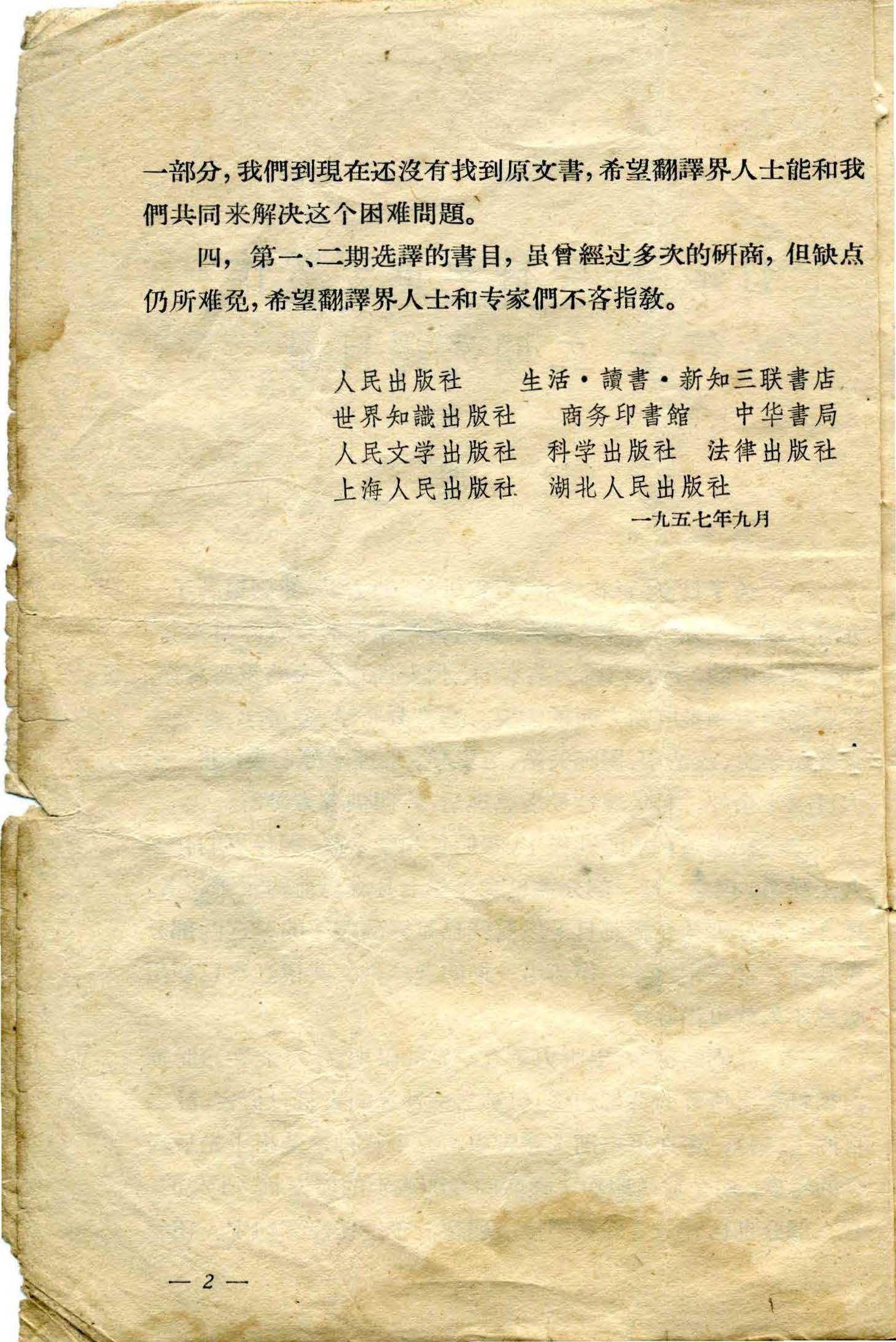 “藍(lán)皮書(shū)”雖然是由人民出版社的三聯(lián)書(shū)店編輯部編制,但它實(shí)際上是一個(gè)全國(guó)性的翻譯、出版規(guī)劃,所以,需要聯(lián)合其他出版社一道推進(jìn)。筆者手頭持有的一份由人民出版社、三聯(lián)書(shū)店、世界知識(shí)出版社、商務(wù)印書(shū)館、中華書(shū)局(當(dāng)時(shí)商務(wù)印書(shū)館、中華書(shū)局尚未正式獨(dú)立)、人民文學(xué)出版社、科學(xué)出版社、法律出版社、上海人民出版社、湖北人民出版社在1957年9月聯(lián)合編印的《哲學(xué)、社會(huì)科學(xué)重要著作第一、二期選譯目錄》(以下簡(jiǎn)稱(chēng)“聯(lián)合版選譯目錄”)便是這些出版社建立起來(lái)的一項(xiàng)工作機(jī)制,相互通報(bào)信息,共同發(fā)布消息?!奥?lián)合版選譯目錄”第一期的信息較為詳盡,標(biāo)注了有關(guān)書(shū)目擬承擔(dān)的出版社和已經(jīng)約定的譯者,但第二期僅列出出版社,沒(méi)有注明譯者。