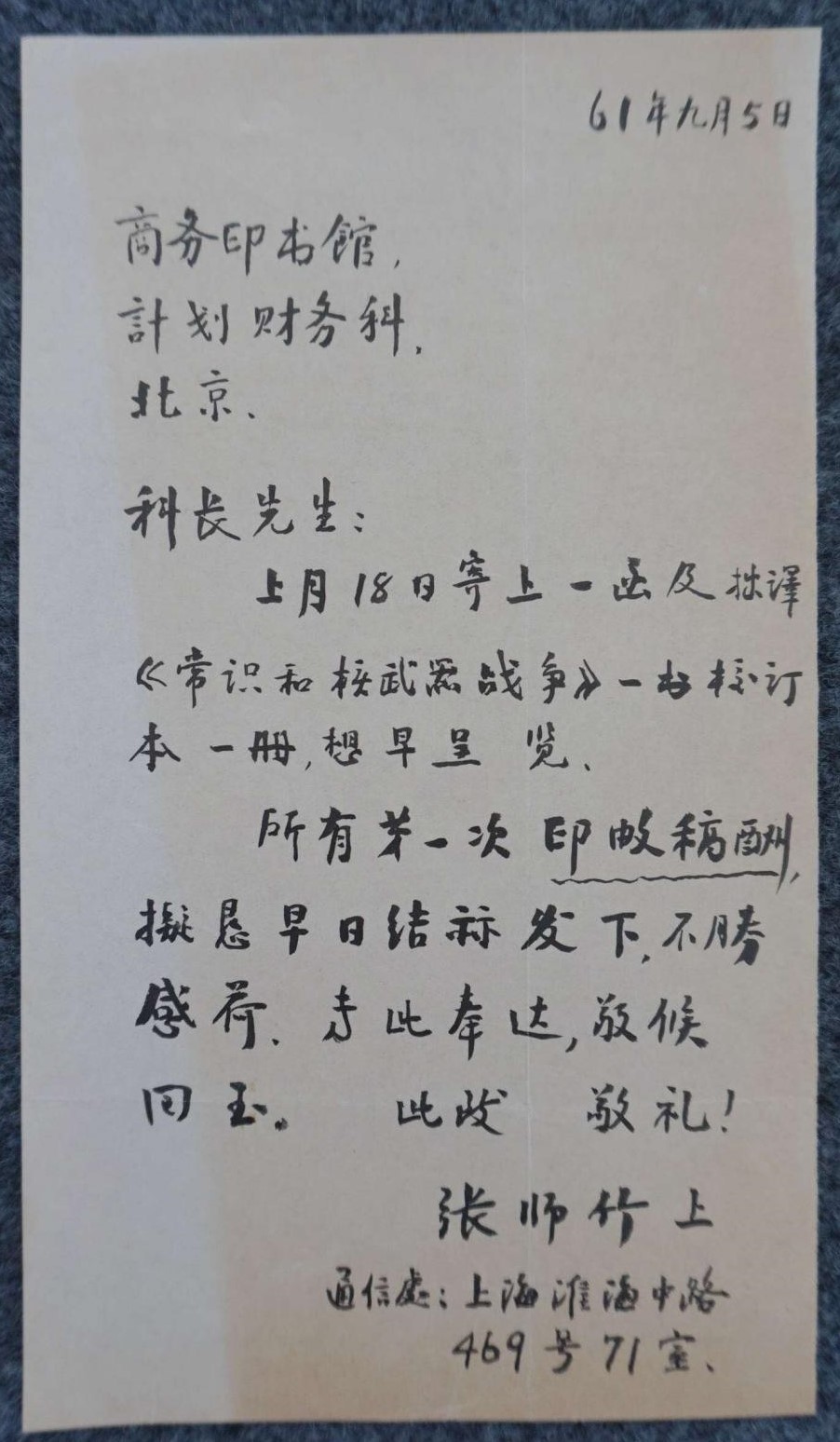 1963年商務(wù)印書(shū)館復(fù)函張慰慈,譯稿不發(fā)排