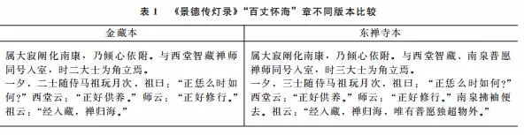 由以上數(shù)例可以看出,“非實(shí)質(zhì)性異文”是在刊刻流傳過程中由于字形、字音等因素形成的異文,對于此類異文,可以利用文字、音韻、避諱等小學(xué)知識,判裁其正誤,并最終確定一個(gè)正確的異文。而對于下面這些“實(shí)質(zhì)性異文”,則很難用小學(xué)的方法抉擇出一個(gè)“正確”的文本,如卷6“百丈懷?!闭拢ㄒ姳?)。