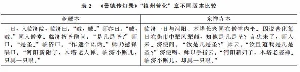 《景德傳燈錄》是北宋真宗朝吳僧道原所作的禪宗燈史,其書集錄自過去7佛,及歷代禪宗諸祖共1701人的傳燈法系。此書的版本約可分為四個(gè)系統(tǒng):以金藏廣勝寺本為代表的中原藏經(jīng)系統(tǒng),以東禪寺本為代表的南方藏經(jīng)系統(tǒng),元延祐三年(1316)希渭刻本系統(tǒng),《萬僧問答景德傳燈全錄》系統(tǒng)。通過不同版本間的對校,可以發(fā)現(xiàn)大量異文,這其中既有“非實(shí)質(zhì)性異文”,也有“實(shí)質(zhì)性異文”。