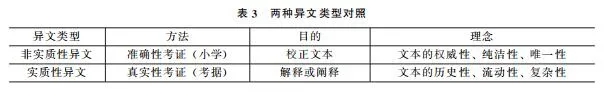 通過《景德傳燈錄》的具體例證可以看出:在文本的對校中會(huì)出現(xiàn)兩種異文,“實(shí)質(zhì)性異文”和“非實(shí)質(zhì)性異文”。此兩類異文普遍存在于??睂?shí)踐中,但對兩類異文的處理與關(guān)注,中西方存在著比較大的差異。我國由于進(jìn)入印刷時(shí)代較早,保存的抄本、寫本相對較少,所以異文中“非實(shí)質(zhì)性異文”所占比重較大,而在處理“非實(shí)質(zhì)性異文”方面積累了豐富的經(jīng)驗(yàn)與技術(shù),借助于文字學(xué)、音韻學(xué)、訓(xùn)詁學(xué)等小學(xué)的知識,大量的“非實(shí)質(zhì)性異文”可以得到解決。然而,由于印本時(shí)代典籍的整齊化過程,大量的“實(shí)質(zhì)性異文”已被消除,多數(shù)典籍文本趨于整齊,可以說很長的時(shí)間內(nèi),“實(shí)質(zhì)性異文”并沒有受到傳統(tǒng)??睂W(xué)的足夠關(guān)注。20世紀(jì)以來,簡牘、帛書、敦煌文書、黑水城文獻(xiàn)、日本古抄本等文獻(xiàn)的陸續(xù)發(fā)現(xiàn),使我們得以重見抄本時(shí)代的典籍文獻(xiàn),也使我們知道,典籍整齊化之前存在著大量的“實(shí)質(zhì)性異文”。而這些“實(shí)質(zhì)性異文”既不能從典籍內(nèi)部通過小學(xué)的方法得以解決,也無法全部抉擇出最佳文本,定于一尊。只有將文化環(huán)境、意識形態(tài)、權(quán)力機(jī)制考慮進(jìn)去,才能解釋這些異文產(chǎn)生的機(jī)制,對這些異文進(jìn)行合理的闡釋。也就是說,對于“非實(shí)質(zhì)性異文”可以運(yùn)用文字、音韻、訓(xùn)詁等小學(xué)的方法,通過“準(zhǔn)確性”考證,最終校正錯(cuò)謬,整理出一個(gè)“正確”的文本。而對于“實(shí)質(zhì)性異文”,則需要綜合運(yùn)用考據(jù)學(xué)的方法,進(jìn)行“真實(shí)性”考證,對異文產(chǎn)生的文化環(huán)境、意識形態(tài)及權(quán)力機(jī)制進(jìn)行分析,弄清異文產(chǎn)生的機(jī)制。對于此類異文,或許最終無法決定異文的正誤,進(jìn)言之,這些異文本身其實(shí)并無“正誤”之分,而只是不同知識譜系中的形成物。對于“非實(shí)質(zhì)性異文”,可以通過校正錯(cuò)誤得到正解;而對于“實(shí)質(zhì)性異文”,只能通過對比作出解釋。“非實(shí)質(zhì)性異文”的處理實(shí)際上是對文本權(quán)威性、純潔性、唯一性的追求;“實(shí)質(zhì)性異文”的處理則是對文本歷史性、流動(dòng)性、復(fù)雜性作出的分析與描述(見表3)。而要發(fā)現(xiàn)、解決文本歷史性、復(fù)雜性的問題,則需借助于文本的考古。