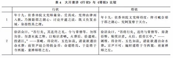 首先來看,從行狀到塔銘普濟(jì)的生平信息發(fā)生了哪些變化?通過對比發(fā)現(xiàn),除了文本形式(如行狀只敘不銘,而塔銘則有敘有銘)、語言表達(dá)不同之外,有些史實(shí)也發(fā)生了變化(見表4)。