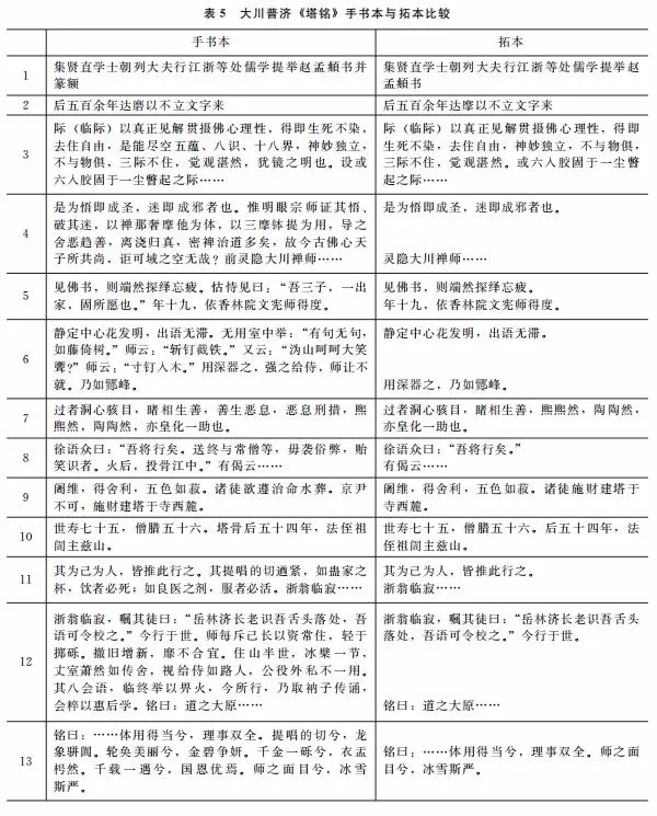 普濟(jì)塔銘的典型性在于:除了行狀之外,趙孟頫手書本塔銘及塔銘的拓本皆存世。從塔銘的制作過程可知,趙氏手書墨跡本代表了塔銘上石前的狀態(tài),而塔銘拓本則代表塔銘上石后的狀態(tài)。依于常理,兩者應(yīng)大致不差。然而兩相對比,仍有很大的差異。趙孟頫手書本《靈隱大川濟(jì)禪師塔銘》現(xiàn)藏上海博物館,卷子裝,寬34.4厘米,長40.9厘米。190行,每行14—15字。塔銘拓本154行,每行9—10字。兩者對比,共有13處不同,拓本比手書本少了312字之多(見表5)。