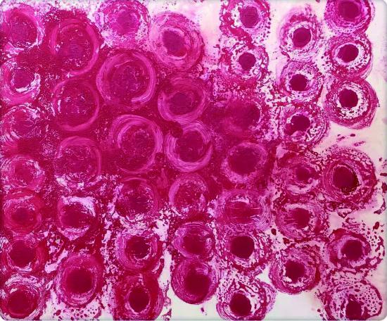 在賀賀的作品中,我們能夠看到深深淺淺的許多層次,那是她反反復(fù)復(fù)涂抹的痕跡。正是通過(guò)一遍又一遍的渲染,或留白,或覆蓋,賀賀把她生命的經(jīng)驗(yàn)、細(xì)膩的情感,以及深刻的認(rèn)識(shí)等,一并融入到作品中,從而使她的畫面森羅萬(wàn)象,具有了多彩的意向與豐富的層次。尤其是她運(yùn)用一些大大小小的點(diǎn)來(lái)構(gòu)成畫面的肌理,呈現(xiàn)出一種斑駁感,更讓我們透過(guò)時(shí)間的痕跡,感受到了她情緒的起伏和生命的律動(dòng)……