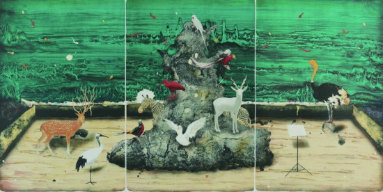 因?yàn)槊舾?,觀念是新穎的。人類用雙腿動作行走,用頭腦判斷思考,用觀念將這兩者結(jié)合,版畫也是在行為與思想并行中形成觀念,從手段與工具的觀念,逐漸過渡到結(jié)果與目的觀念,而每一次觀念的完成都依賴作品的成熟,就像每一次觀念的造端都仰仗畫家的不成熟,只有不成熟的觀念才是敏感的,才充滿了青春的銳氣。徐娜的木口木刻作品《青山綠水》《天之四靈》系列,用一貫的縝密鋪排著新觀念的天羅地網(wǎng),她要捕捉的除了現(xiàn)實(shí)的回音,還關(guān)乎歷史的遺韻,在過去與未來之間建構(gòu)自己認(rèn)識的邏輯。姚元魯?shù)乃∧景孀髌贰兜麎簟鞍缀凇薄贰兜麎簟拔鳀|”》則以光影的律動強(qiáng)化了虛無的實(shí)在,畫面中縱橫伸展的空間彌漫著神秘的夢魘。朱柯橙的銅版作品《The shape Between Uslll》在漫無邊際的散淡中拾撿日常的瑣碎,都是在新的觀念的探索中尋找立足之點(diǎn),趙子亮的絲網(wǎng)版畫《五號線的日?!废盗信c劉海辰的銅版作品《失志與成輝》是從完全不同的立場闡述著相似的疑問,匆匆而去的日常,究竟體現(xiàn)了怎樣的意義,有形或無形的生命如何面對逝去。以往人們習(xí)慣于在畫面中尋找答案,而新的觀念只提供了敏感,在新的感覺中,去體味被畫家擦拭一新的老問題,去思考其中新的價(jià)值或意義,畫家正是通過自己的創(chuàng)作,透視出自然與社會的關(guān)系,從自然的角度認(rèn)識社會,從社會的立場探究自然,是畫家以自己對觀念的敏感,串連起主體與客體,主觀與客觀之間的通道。