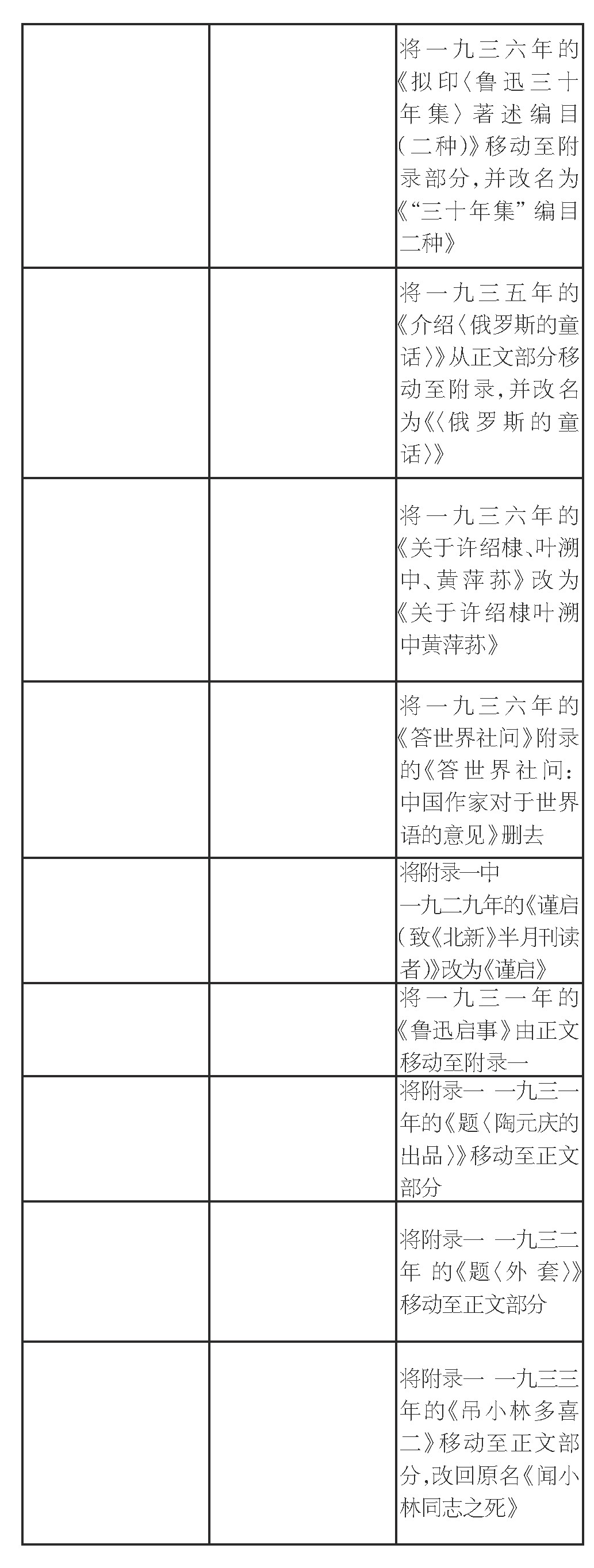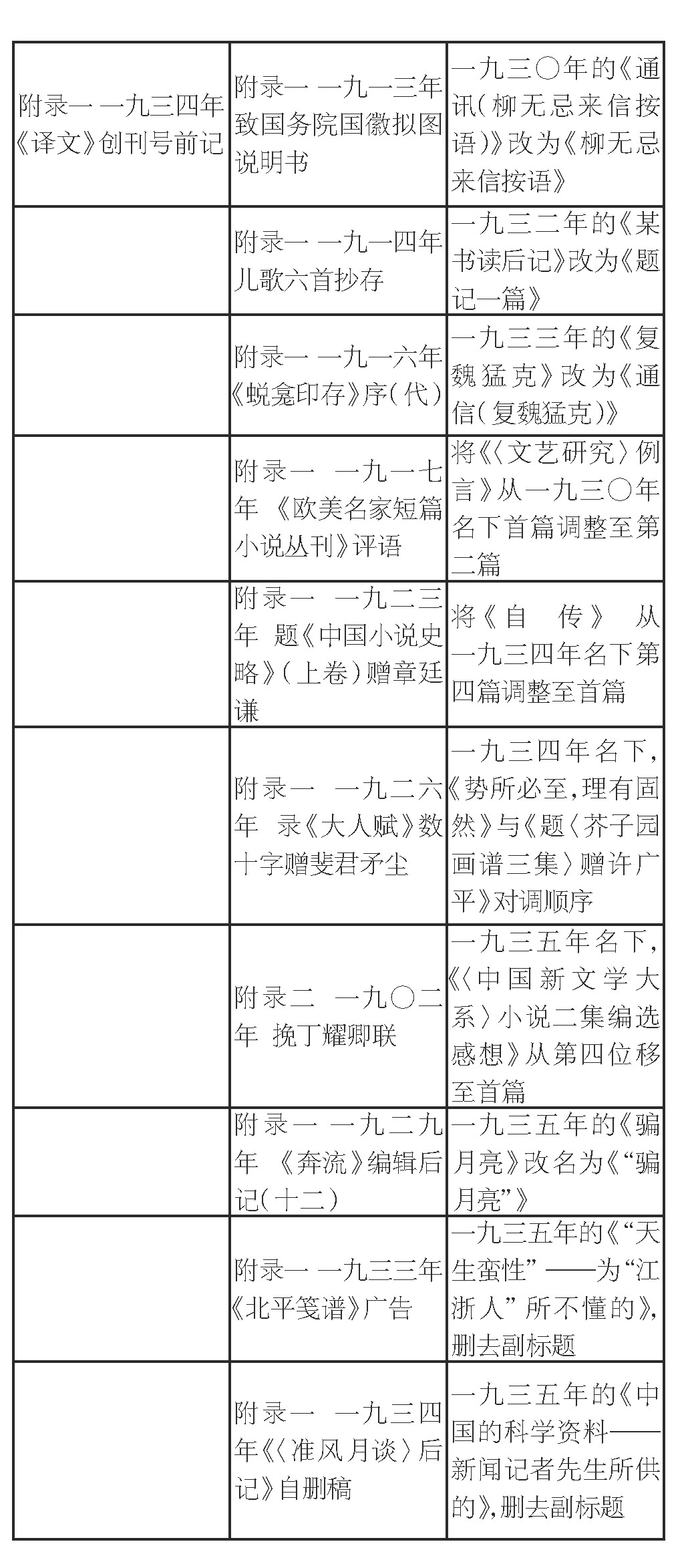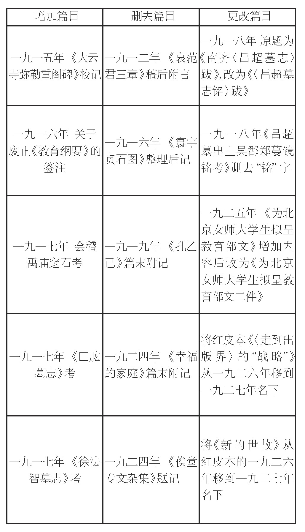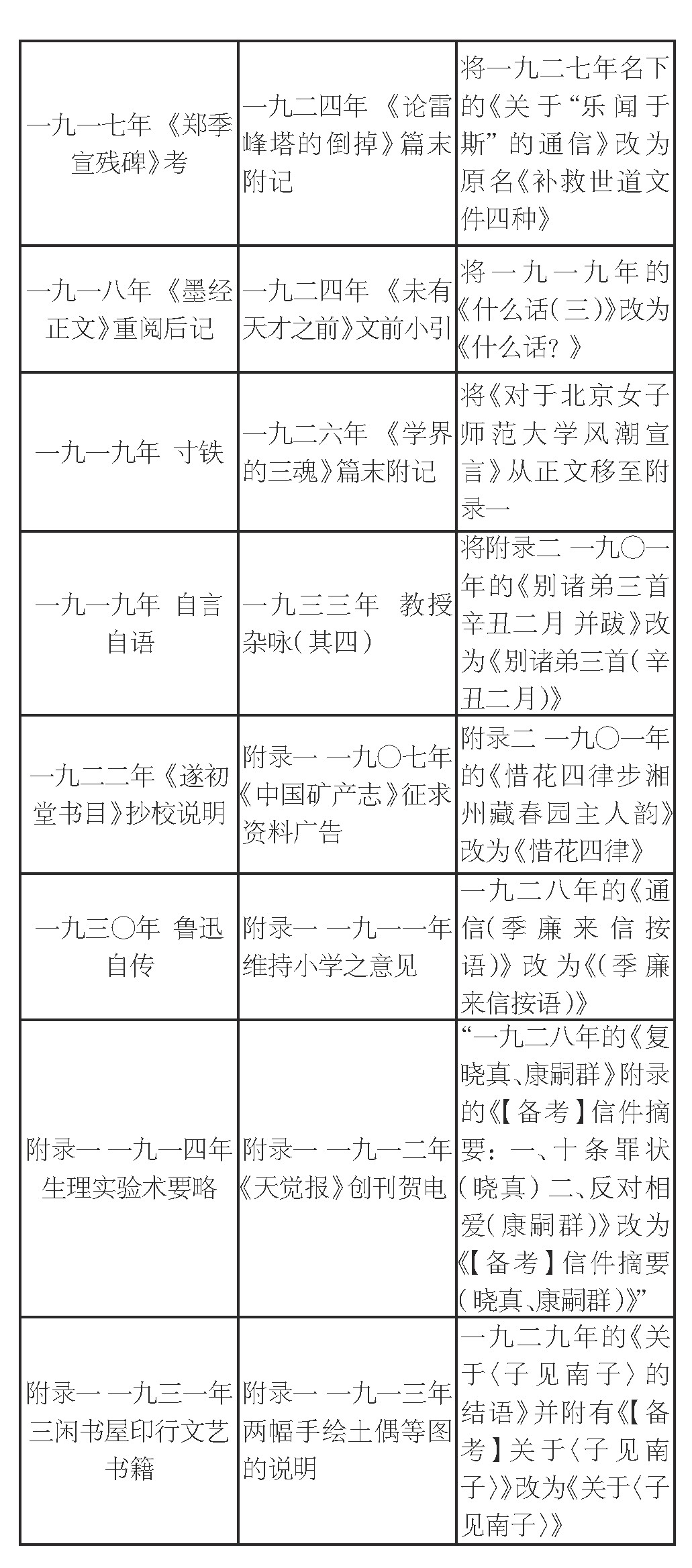 《集外集拾遺補編》篇目的變動分為三種情況——增、刪、改,數(shù)量依次遞增:增加篇目14篇,刪除篇目23篇,更改篇目42篇。更改篇目又可細分為更改標題、調(diào)整順序、調(diào)整篇目位置。更改標題25篇,如《南齊〈呂超墓志〉跋》改為《〈呂超墓志銘〉跋》,這是編注者代擬標題的情況。另一種則是恢復原有的標題。如將一九二七年的《關于“樂聞于斯”的通信》改為原名《補救世道文件四種》。調(diào)整順序6篇,根據(jù)發(fā)表時間重新排列篇目順序,如將《〈走到出版界〉的“戰(zhàn)略”》《新的世故》從一九二六年移到一九二七年名下。