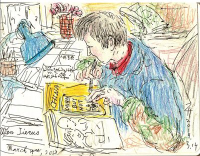 “你看這是兒子蕭桐畫的?!闭宫F(xiàn)在文阿姨手里的是一張?zhí)抗P畫的作家肖像,她翻原書到印有川端康成照片這頁(yè)給我看,我說畫得真好。畫是復(fù)印的,各有兩張,我說把重復(fù)的送我吧,她說一定保存好啊,可別丟了。我說不會(huì)。問她原畫在哪?她非說這就是原畫,已經(jīng)發(fā)給了日本。那自然是電子版了。我也不再和她爭(zhēng)辯了。