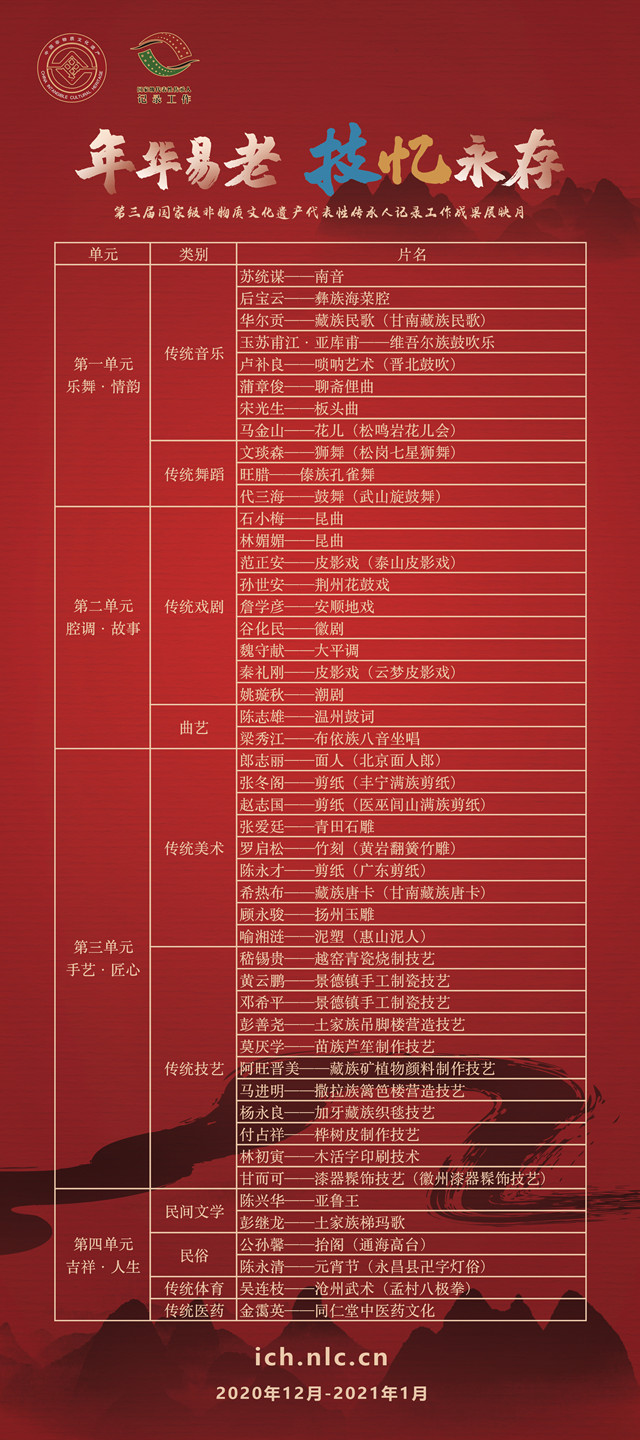 12月31日,隨著48部非遺紀(jì)錄片在國家圖書館中國記憶項目中心的非遺展映專區(qū)(ich.nlc.cn)上線,第三屆“年華易老,技?憶永存——國家級非物質(zhì)文化遺產(chǎn)代表性傳承人記錄工作成果展映月”正式拉開帷幕。