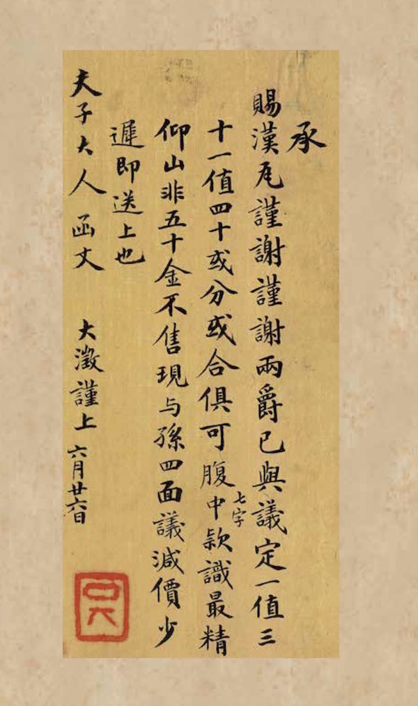 承賜漢瓦,謹(jǐn)謝謹(jǐn)謝。兩爵已與議定,一值三十,一值四十,或分或合俱可。腹中七字款識最精。 仰山非五十金不售,現(xiàn)與孫四面議減價(jià),少遲即送上也。 夫子大人函丈。大澂謹(jǐn)上。六月廿六日