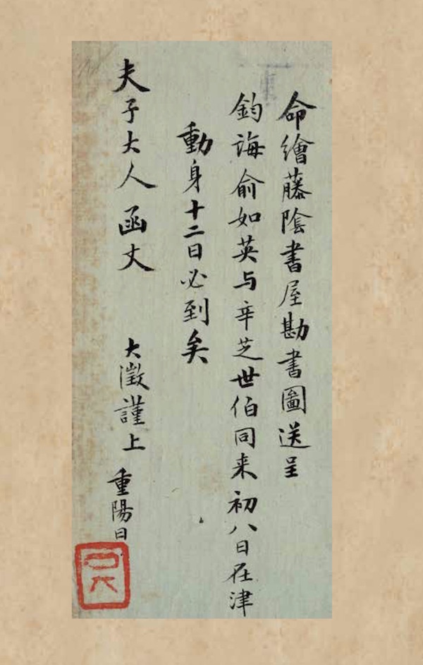 命繪《藤陰書屋勘書圖》送呈鈞誨。俞如英與辛芝世伯同來,初八日在津動(dòng)身,十二日必到矣。 夫子大人函丈。大澂謹(jǐn)上。重陽日。