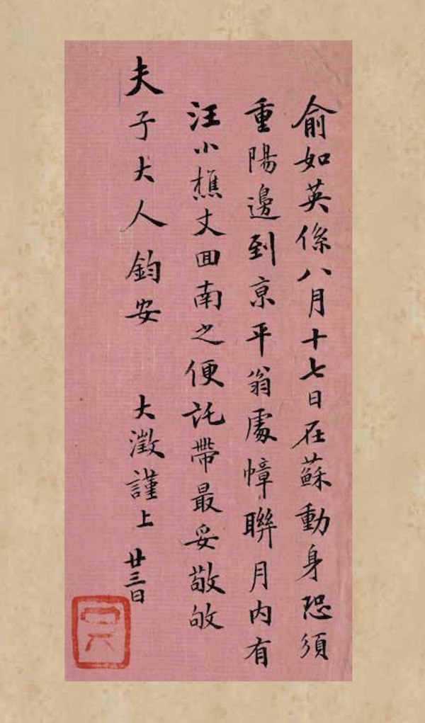 俞如英系八月十七日在蘇動(dòng)身,恐須重陽邊到京。平翁處幛聯(lián)月內(nèi)有汪小樵丈回南之便托帶最妥。敬敂 夫子大人鈞安。大澂謹(jǐn)上。廿三日。