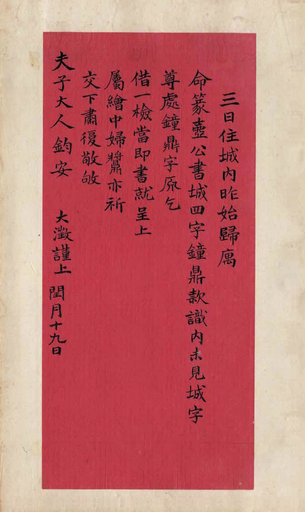 三日住城內(nèi),昨始?xì)w寓, 命篆“壺公書城”四字,鐘鼎款識內(nèi)未見城字, 尊處《鐘鼎字原》乞借一檢,當(dāng)即書就呈上。屬繪中婦?亦祈交下。肅復(fù),敬敂 夫子大人鈞安。大澂謹(jǐn)上。閏月十九日